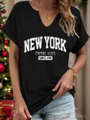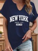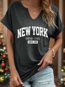 レディース ニューヨーク エンパイア レタープリント Tシャツ - カジュアル ロールアップ 半袖 Vネック トップ、ヘザーグレー 大胆なホワイトテキスト、レギュラーフィット Hシルエット、洗濯機対応 オールシーズン快適、ノッチVネック ティー、リラクスタフィット トップ
