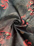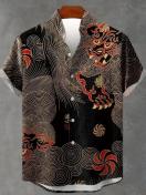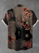 メンズ夏用半袖スリムフィット3Dプリント民族風ドラゴンパターンシャツ - ブラック、レッド&ゴールドアクセント付き、通気性のある軽量生地、スタンドアップカラー、洗濯機可カジュアルトップ