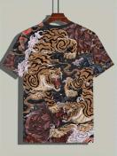 メンズタイガープリント半袖Tシャツ - ブラックとオレンジのデザイン、クルーネック、ポリエステル製、夏のカジュアルウェアに最適