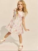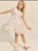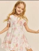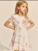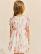 ホワイトとピンクの花柄が特徴のフリル付きカジュアルワンピース。