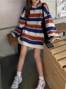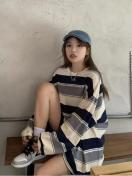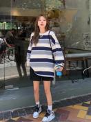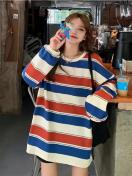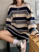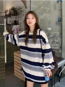 韓国ファッション オーバーサイズパーカー 長袖 レディース トップス ストライプ Tシャツ ロング Tシャツ