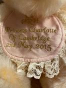 ピンクのよだれかけにはPrincess Charlotte of Cambridge 2nd May 2015 と金糸で刺繍されています