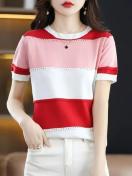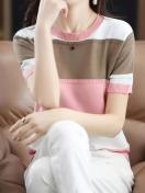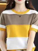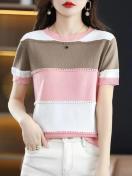 レディース アイススリッキーファイバー100%ビスコースTシャツ - エレガントなカラーブロック ラウンドネック カットアウトディテール付き、通気性のある生地、春夏秋用 リラックスタイト、洗濯機可