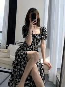 女性用スクエアネックフローラルプリントAラインドレス - 軽量で通気性のある洗濯機対応ブラック&ホワイト花柄ドレス、春夏秋向けカジュアルからセミフォーマルまで、季節のワードローブ必須アイテム、エレガントスタイル、耐久素材、ファッション愛好家向け