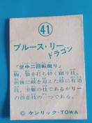 ブルース・リー ミニカード 41「す空中二回転蹴り」です。ケンリック/TOWA。縦7cm幅5cm。年代物なので汚れや色あせ角めくれなど有り。また左右1/3付近に上から斜め下への大きな割れ筋が入っています。状態は悪いです。現状渡しと成りますので画像を良く参照の上落札お願い致します。最安送料はミニレター¥85です。締切日時