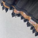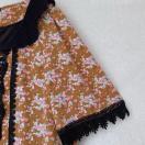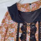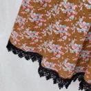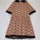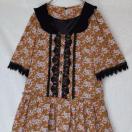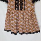 ブラウン系の花柄デザインにレース装飾が施された半袖ひざ丈ワンピース。