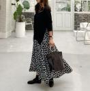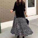 このフレアスカートは、黒と白のドット柄が特徴で、シンプルながらも目を引くデザインです。Aラインのシルエットは、体型を美しく見せる効果があります。