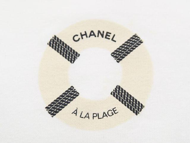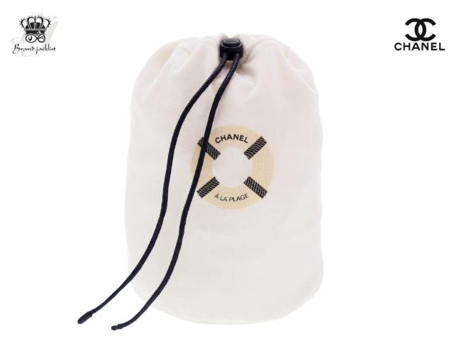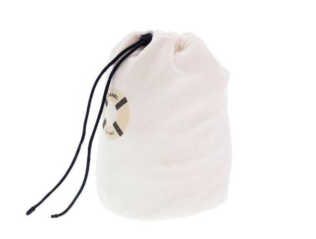 シャネル ビューティーのノベルティ巾着ポーチです。"フライト前に特別なサービス体験を"と、2019年に羽田空港で開催されたポップアップイベント「CHANEL A LA PLAGE」で、香水ゾー ドゥ シャネルを購入した方にプレゼントされたフレグランスポーチになります。 フランスのリゾート地ドーヴィルのビーチをイメージした会場だったので、ポーチには浮輪のイラスト入りになっています。数量限定だったために珍しい巾着になっています。