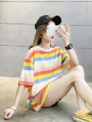 レディース プラスサイズ ルーズフィット キャラクタープリントTシャツ - パステルカラーブロック 半袖 ラウンドネック トップ、通気性中程度のストレッチ素材、長丈 カジュアル 夏春秋 洗濯機可、トレンディなストリートウェア、透けない素材