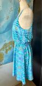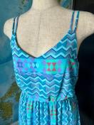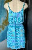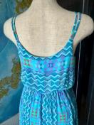 青系の幾何学模様のノースリーブドレス、カジュアルで夏に最適。