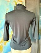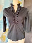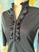フリル付きボタン開きのブラック五分袖ポロシャツ、ストレッチ素材で快適な着心地。