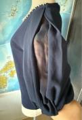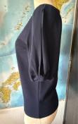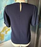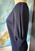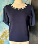 ビーズ装飾のネックラインが特徴的なネイビーの半袖トップス。