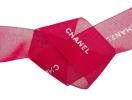 シャネル店舗で使われていたラッピングリボンです。2022年のホリデー限定品になっており、薄手で透けて見える柔らかいシフォン生地になっています。赤色は珍しく、シルバーのCHANELロゴが12個入っています(うち1個は銀箔がはがれています)。 長さ130cm、幅4.6cmのワイドリボンはハンドメイド材料としてリメイクもできます。