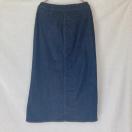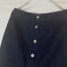 ダークデニムのボタンフロントタイトスカート、サイドポケット付きでスタイリッシュ。
