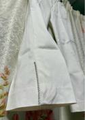 ビジュー付きのホワイトスラックス、エレガントなデザイン。