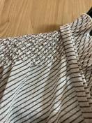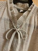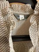 薄いグレージュにブラウンの細いストライプです。首元で結ぶ紐は所々縫い付けられているので不要な場合には簡単に切り離せそうです。