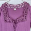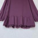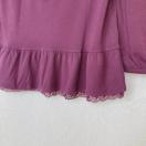 レース付きスクエアネックのパープル七分袖トップス、フリル裾で女性らしい印象。