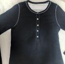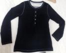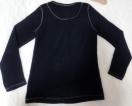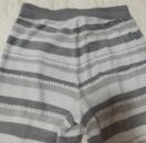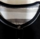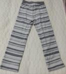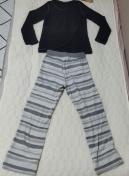 長袖のブラックトップスとグレーボーダーパンツのセット。