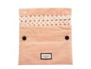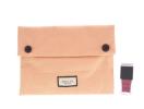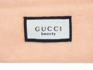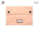グッチビューティーのノベルティポーチです。柔らかく温かな印象のサーモンピンクのポーチには「GUCCI beauty」のタグが縫い付けられてあり、二つのボタンで開閉するフラップタイプになっています。内側は可憐なバラの花柄プリントなので、開けた時にポイントになって可愛いです。マチがない分、厚さが出にくいフラットポーチは一つあると便利ですよ。