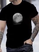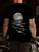 メンズ スタイリッシュ ブラック クルーネック ティーシャツ、月明かりの波グラフィック付き - 柔らかく通気性のある生地でカジュアルウェアに最適、オールシーズン、毎日のTシャツ | モダンな外観 | 快適なフィット感