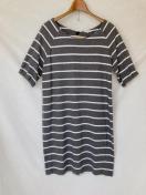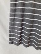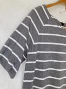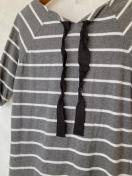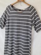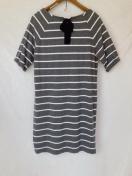 ダークグレーと白のボーダーデザインのリボン付きボートネック、チュニック、ワンピース。