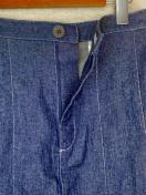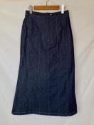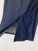 ダークデニムのタイトスカート、ホワイトステッチが特徴的で、フロントボタン付き。