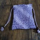 紫色の花柄の布製巾着袋、調整可能な紐付き。