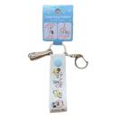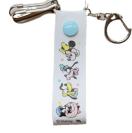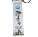 ディズニーのキャラクター ミッキー、ミニー、ドナルド、デイジー、グーフィー 、プルート 、ビートとミッキー の甥っ子のフェルディ、モーティがイラストが施されたホワイトのレザー風のループキーホルダー。