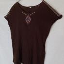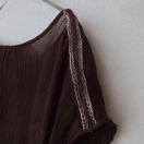 ブラウンの刺繍が施された半袖チュニック、プリーツ、しわ加工素材でリラックスした着心地。