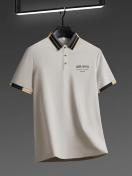 「MILANO ITALIA」文字プリントのメンズ軽量ソフトポロシャツ - 通気性のある夏のカジュアル&ビジネスウェア、レギュラーフィット、ボタンアップカラー、ダークブルーにゴールデン&ホワイトアクセント、休暇や日常の使い方に最適、休暇用衣類、洗練されたスタイル、品質のある工芸品