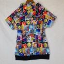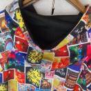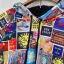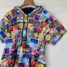 カラフルなプリントが特徴のゆったり、ラグランのフード付きパーカー。