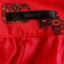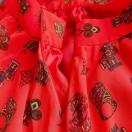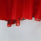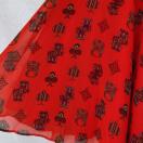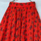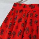 鮮やかな赤色のフレアスカート、軽やかな素材とハート、スペードやダイヤ、クローバー柄にエスニックな模様が特徴。