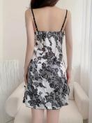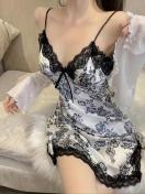 女性用フローラルプリントレーストリムスリープシャツ - ブルー&ホワイト柄の軽量ストレッチポリエステルブレンドナイトガウン、ベッドルーム&ラウンジウェア用リラックスフィット