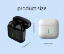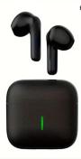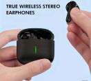 ブラックのワイヤレスステレオイヤフォン、充電ケース付きでコンパクトなサイズ。