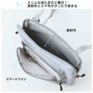 メインコンパートメントに長財布、前面ポケットにはスマホなどがちょうど収まる構造になっており、スリムな見た目ながらしっかり収納できる。