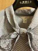 少しシャリ感と光沢感ある生地で(画像5生地アップ)首元リボンは結ぶのではなく1番上のボタンにループがあり、くぐらせます。