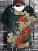 メンズ アニマルプリント スタイリッシュ ラウンドネック 半袖 Tシャツ - カジュアル 夏スポーツ トップス、ポリエステルニット生地製、大人向け、夏のスタイル。