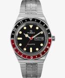 1979年当時のモデルを復刻したQ TIMEX。アルマイト加工の2色ベゼルや、細かい作りのステンレス製ブレスレット、便利なデイ・デイト機能、風合いのあるドーム風防、そしてケース裏のバッテリー交換用ハッチなど、こだわりのディテールが満載です。奇しくも時計ファンの間で通称「ペプシ」カラーと呼ばれる他社製品が入手困難となり同じカラーリングで注目を集めたQ TIMEX Q。ビンテージウォッチの世界で通称“コーク”ベゼルとして知られる、黒赤ベゼル。赤青のペプシ・カラーよりも幾分落ち着いた印象ゆえ、こちらを好まれる方が多いのも事実。文字盤のカラーも精悍なブラックで、こちらも甲乙つけがたいカラーリングです。