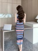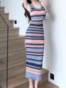 レディース スリーブレスドレス - カラーブロックストライプ ボディコン ミディ丈 ラウンドネック 春夏秋用 中伸縮素材 カジュアルバケーション&休暇着 コントラストカラー ファッション ドレス