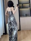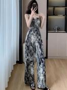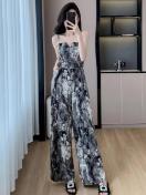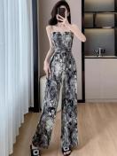 エレガント インクプリント ワイドレッグ ジャンプスーツ バックタイデザイン シルク風 涼感 素材 オールシーズン対応
