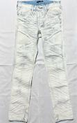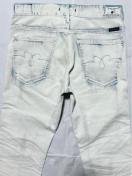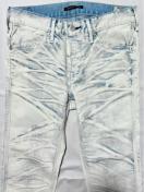 ライトブルーのデニム生地に色落ちの様なヒゲ状やシワを施した白系コーティング加工が目を惹く仕様