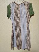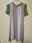 薄手の伸縮性のある半袖カーキサマーニットと、1点だけでも着られるオレンジ系の柄入りワンピースのセットです。