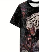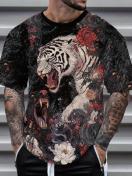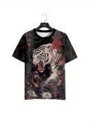 メンズ タイガー&フローラルプリント 半袖Tシャツ - 鮮やかなデジタルプリント、通気性ラウンドネック カジュアルティー 春/夏用、ジム&アウトドア活動向け、洗濯機可