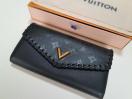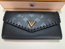 レザーが編み込まれたフラップとVシグネチャーの金具が印象的な長財布。