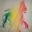 プリントする前にTシャツを、一枚づつランダムに手の込んだステッチ(つまみ加工)や刺繍やブリーチしてます。あえてラフに加工する事で、独特な一点物の風合いが楽しめます。(商品によって加工は様々です) ラスタカラーのグラデーションプリントが綺麗です。