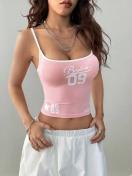 女性用Y2Kストリートウェアクロップトップ「ボストン99&スターグラフィック」- コントラストロールエッジ、パステルピンク&ホワイト、中伸縮性、洗濯機可春夏カジュアルシャツ、サマーファッション、アーバンストリートウェア、コントラストカラーデザイン