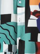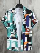 メンズカラーブロックグラフィティパターン半袖ボタンアップラペルシャツ、ハワイアンスタイルレジャートップ、夏の休暇とバケーションリゾート用