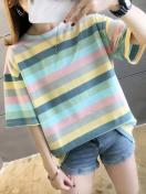 レディース プラスサイズ ルーズフィット キャラクタープリントTシャツ - パステルカラーブロック 半袖 ラウンドネック トップ、通気性中程度のストレッチ素材、長丈 カジュアル 夏春秋 洗濯機可、トレンディなストリートウェア、透けない素材