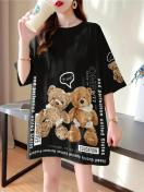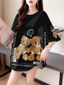 女性用プラスサイズ カジュアルカートゥーンベアプリントTシャツ - オーバーサイズ、ゆったりフィット、半袖、中丈ティー「パーフェクト」デザイン付き、ブラック、春のカジュアルトップ | リラックスフィットTシャツ | ポリエステルブレンド、ベアTシャツ