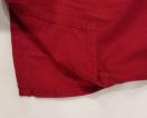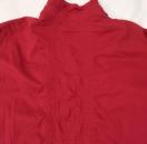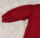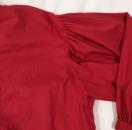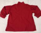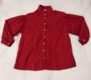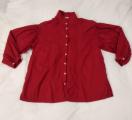 バルーンスリーブの赤い長袖シャツ、スタンドカラーと6つのボタン付き。